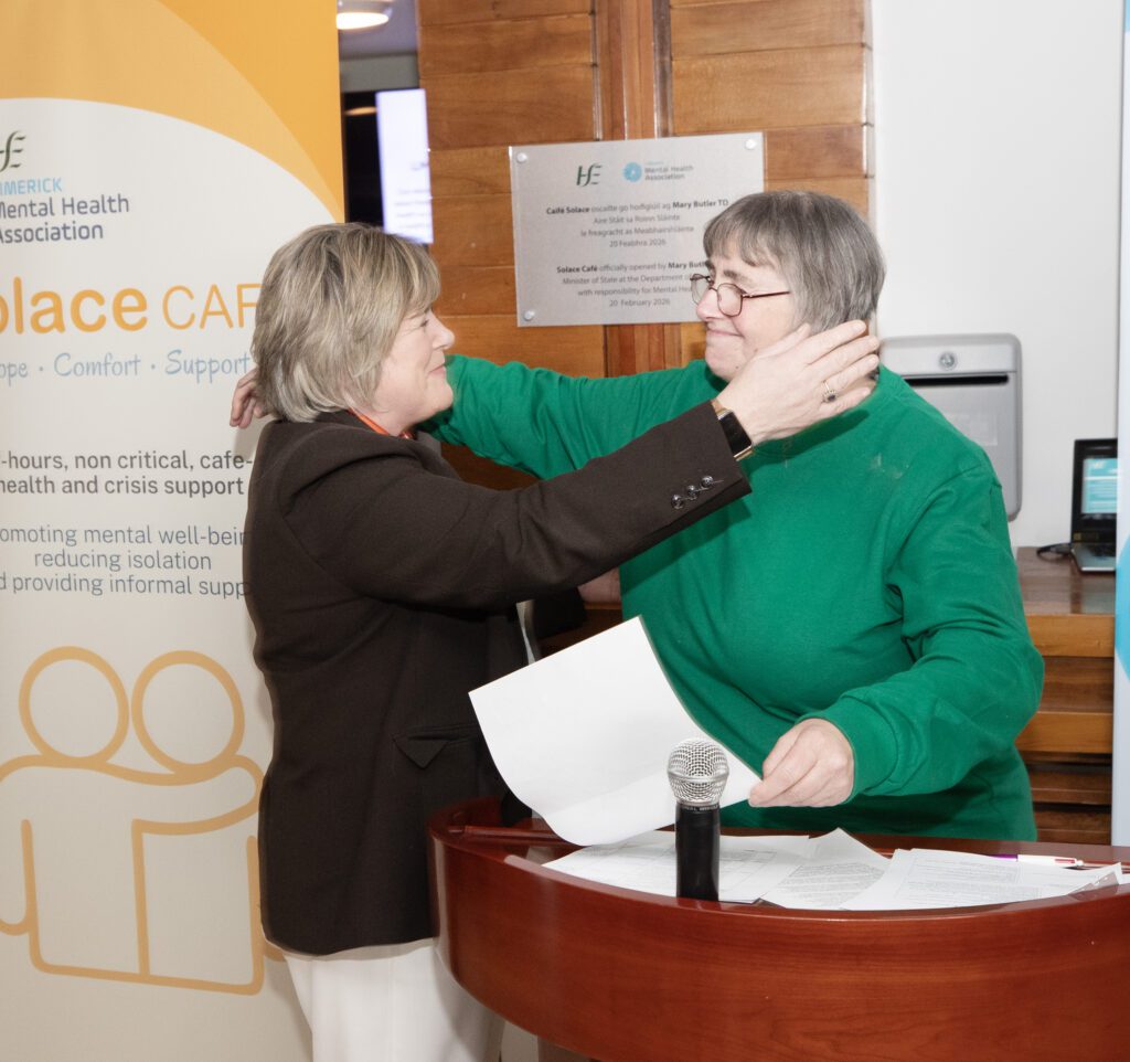 Speaking in Limerick as she officially opened the Solace Café this Friday, Mary Butler TD, Minister of State at the Department of Health with responsibility for Mental Health, said: “The Solace Café is a warm, friendly place where anyone going through a tough time can come in, have a chat, and get a bit of support. It’s not a clinical setting, it’s a safe, welcoming space right in the heart of Limerick City for people who need someone to talk to. More than 120 people have already come through the door, and it’s become an important alternative for those who might otherwise feel they have no option but to go to the Emergency Department.