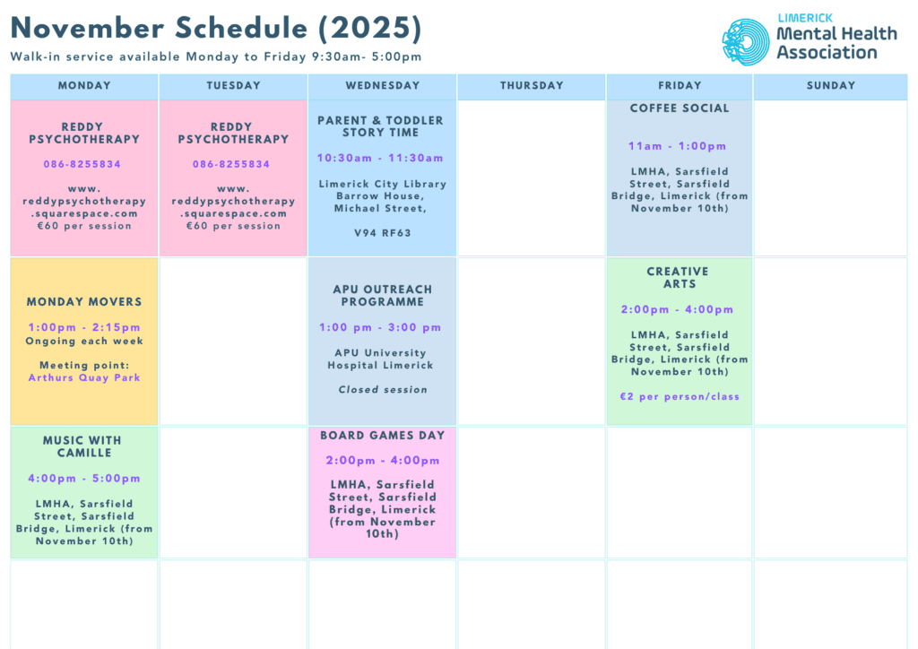 For updates about classes, please make sure to keep an eye on our socials and contact us via email (info@limerickmentalhealth.ie) or Instagram (@limerickmha) to express your interest in any of our classes.